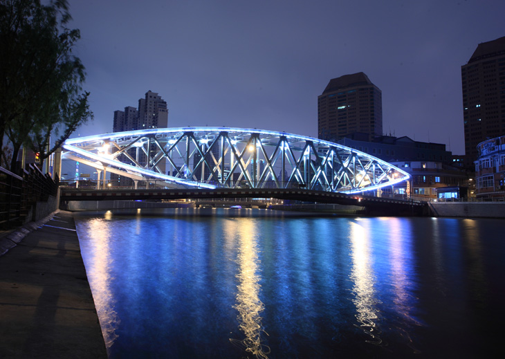 蘇州河橋梁 一百多年來,蘇州河上橋梁的每一次更新,都成為上海這座城市進發的起點,就像一個個腳步,已深深印入了百年新上海的歷史。 閃耀的TOPLITE LED現已融入了蘇州河上18座大橋: ■ 外白渡橋、乍浦路橋、四川路橋、河南路橋是外灘建筑風格的延伸,這一區段以黃色為主色調,泛光照明,突出橋梁歷...